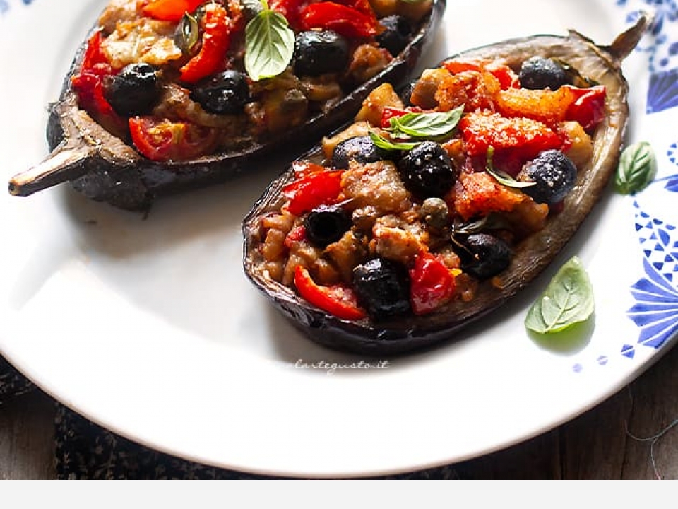 Scoop pulp out of the eggplants using a spoon, leaving skins intact. Chop pulp coarsely and transfer to a bowl. Mix in eggs, Parmesan cheese, capers, and olives. Add 2 tablespoons tomato sauce (or cherry tomatoes cut in small pieces), basil, salt, and pepper. Stuff eggplant skins with mixture.