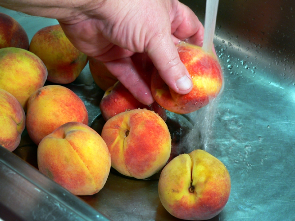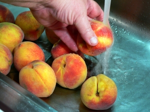 Lightly rinse the peaches under cold running water to remove any dirt of fuzz.