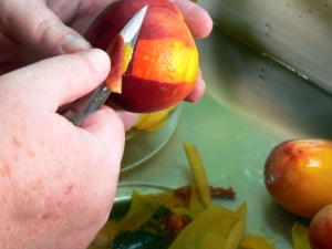 Remove the skins from the peaches. Depending on the peaches, the skins may just pretty much slip off right in your hand. Or, take a paring knife and grab a piece of the skin and easily peel it away. Remove the skin from all of the peaches and cut them in pieces.