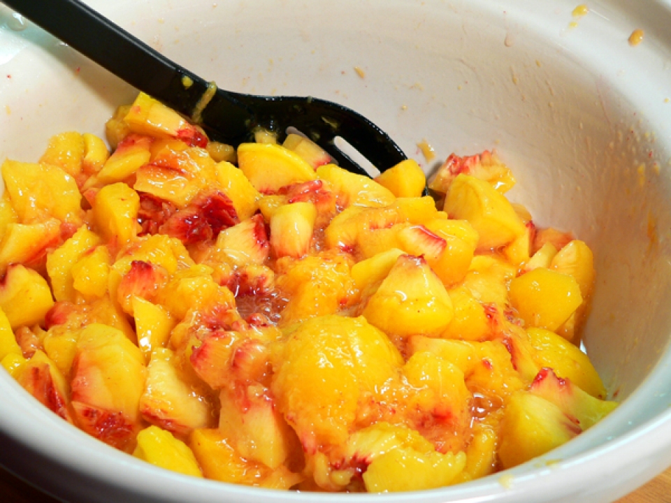 Take a spoon and gently toss the peaches around to coat them all with the lemon juice.