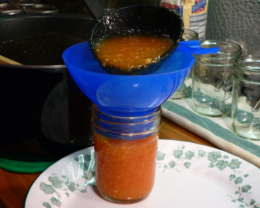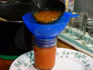 Now comes the fun part….filling the jars. Remove the peach jam from the stove, skim off any foam and discard it…if you have any. Pull a plate up along side the sauce pot and place one of the warm jars from the canner in the plate.