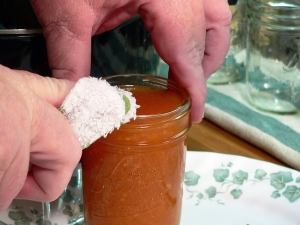 Grab a clean damp cloth and carefully wipe off the thread area of the outside top of each jar. Then, make sure you wipe carefully across the top of each jar. You need to remove any food particles that might have dripped onto the jar as they could prevent a proper seal when the lid comes into contact with the jar surface. Caution though…the jars are hot to the touch.