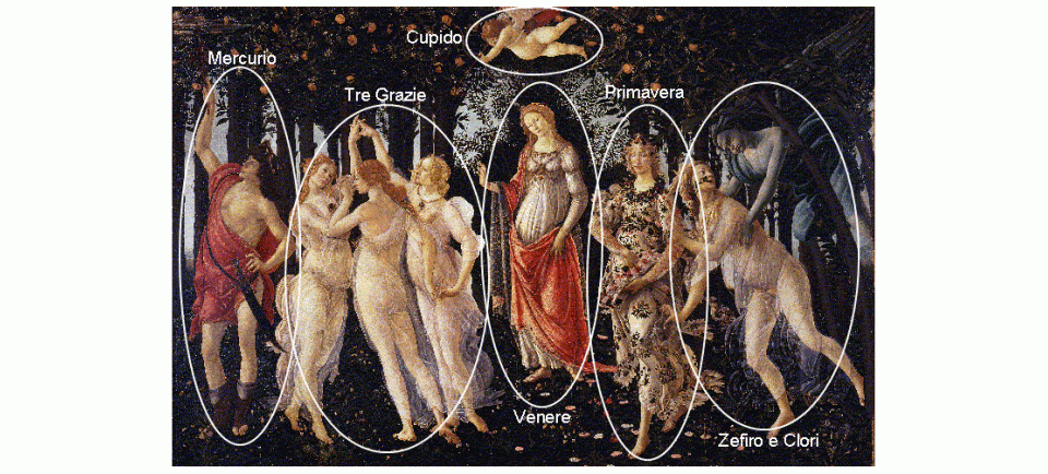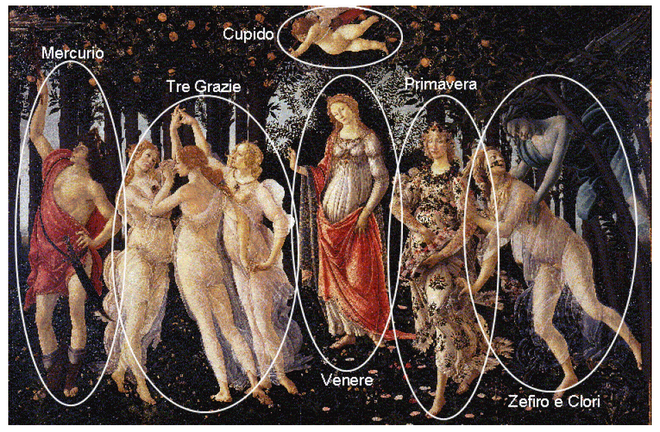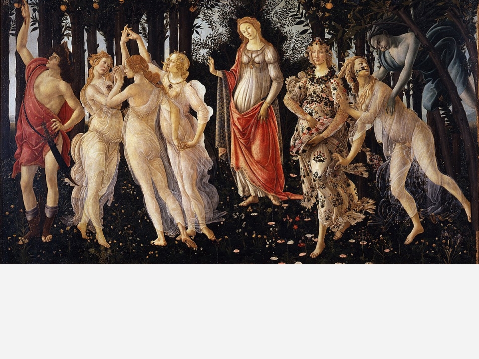 Sandro Botticelli nel 1482 circa dipinse la Primavera, un dipinto a tempera su tavola alto 203 cm e lungo 314, oggi conservato nella Galleria degli Uffizi a Firenze.