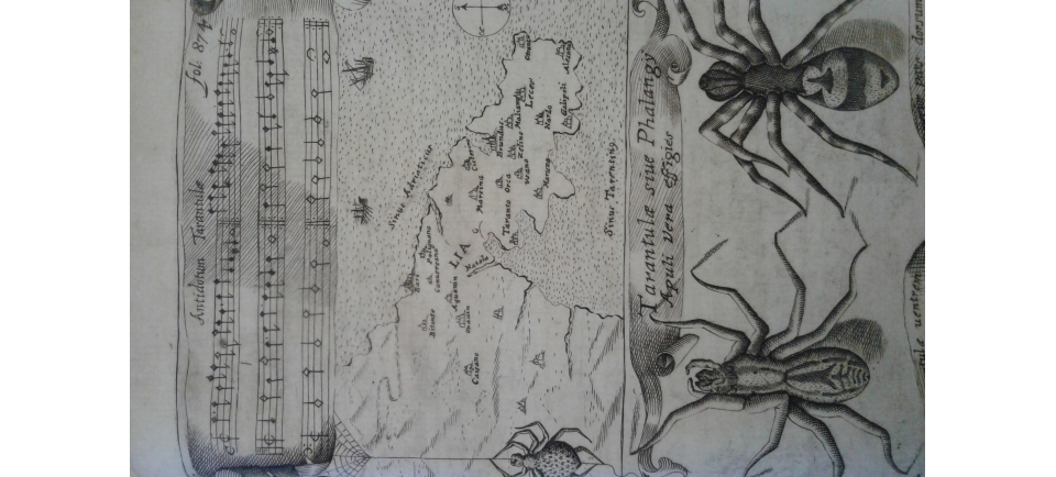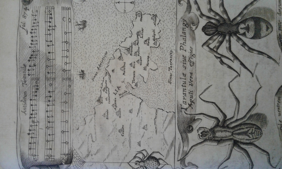 Il nome "tarantella" indica una serie di danze popolari tipiche del sud Italia e molto antiche; questa pagina di manoscritto conservato alla Biblioteca Nazionale di Napoli conferma la tradizione secondo la quale "taranta" è termine dialettale delle regioni meridionali italiane per indicare la tarantola, il famoso ragno velenoso. Chi veniva morso da una tarantola aveva delle crisi convulsive e il ballo della tarantella era la terapia a quel morso: si diceva infatti che ballare la 'taranta' provocasse l'espulsione del veleno attraverso il sudore.
